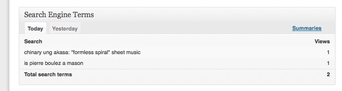WordPress gives you all kinds of neat stats to let you know how your blog is faring in the world. (By the way, Secret Geometry recently passed 16,000 views!!) This includes what search terms people are using to get to your blog. Here is a screen grab of the search engine terms stats for today: