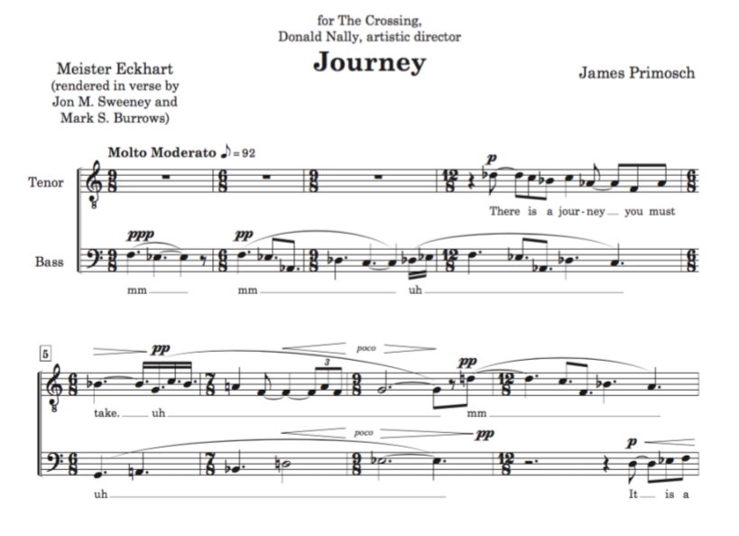 Although I have a catalog of more than a dozen choral pieces, I don’t think of myself as a choral composer, at least not the way some folks are who work almost exclusively in the choral medium. Yet I seem to be in the midst of a time very much focussed on choral music. My most recently completed piece is from this past April: Journey, a Meister Eckhart setting for men’s chorus written for inclusion on a CD of my choral music being recorded by The Crossing. The album will include a short piece for women’s voices, setting a Wendell Berry text, so I thought a piece for just the men would balance the Berry setting and offer a welcome variation in texture in the context of the whole CD which is mostly for mixed chorus.
